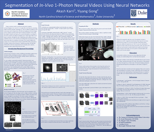 I was a research intern at Duke University’s Gong Lab from June 2018 to February 2019. While there, I worked with other researchers to train/test a 3D Convolutional Neural Network to segment active neurons from 1-photon calcium-imaging videos of in-vivo mice brains. An image of my poster is shown too!